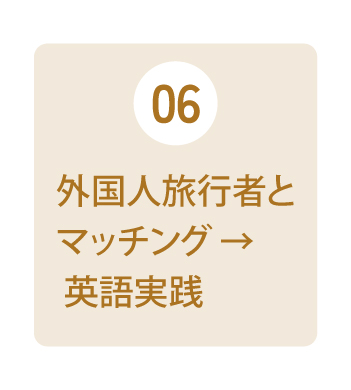 旅行者とマッチングし、実際に英語を使う体験へ。教室で学んだ英語を「使える英語」へと成長させます。