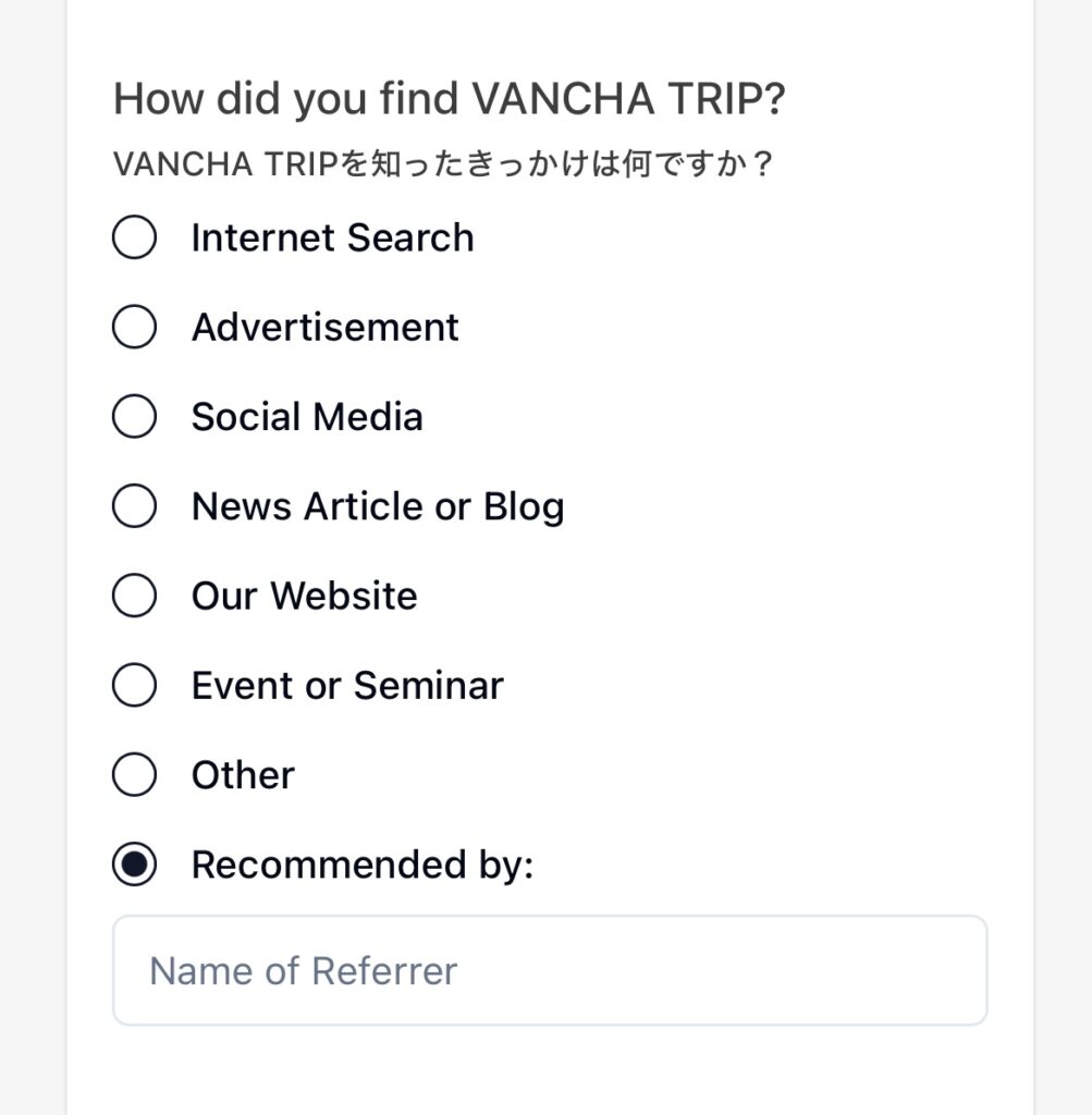 VANCHA TRIPを知ったきっかけは何ですか?という質問は、もしお知り合いの方等からご紹介いただいた場合、Recommended by: を選択していただくと、お名前を記入する欄が表示されます。